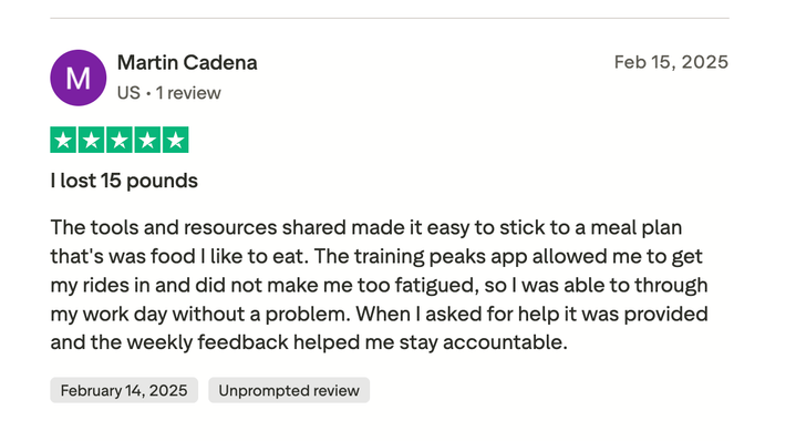 Martin was kind enough to leave a review, where he mentioned how easy the tools and resources were to stick to. He highlighted how simple the meal planning felt, how light and manageable the food choices were, and how the TrainingPeaks sessions gave him structure without leaving him overly fatigued, meaning he could get through his workday feeling good, not drained.