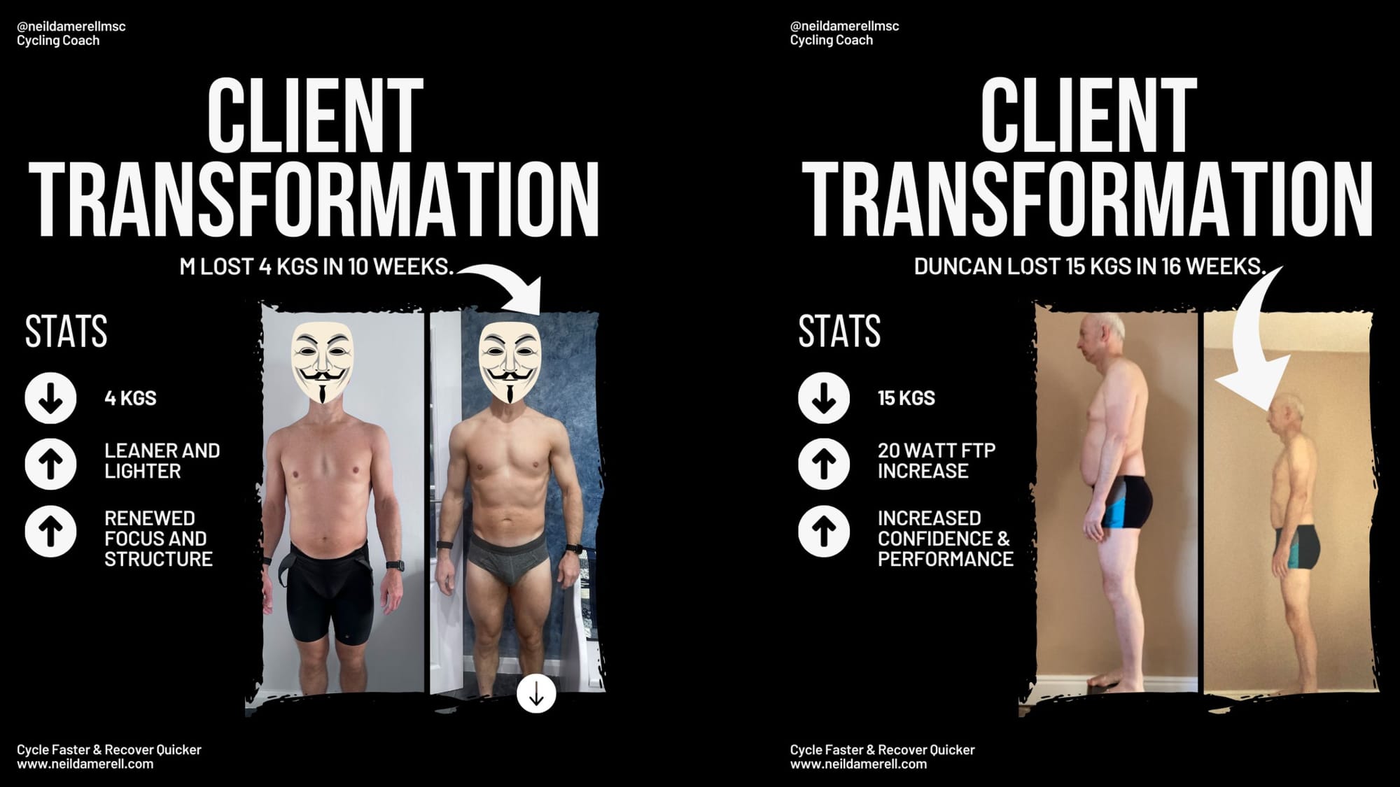 🌟 Client Success: Our clients are not just statistics; they are individuals who have achieved remarkable results. Many of them have lost up to 15 kg in just 16 weeks and have gained an impressive 20 watts to their FTP during this time. Their success stories are a testament to our commitment to your transformation.