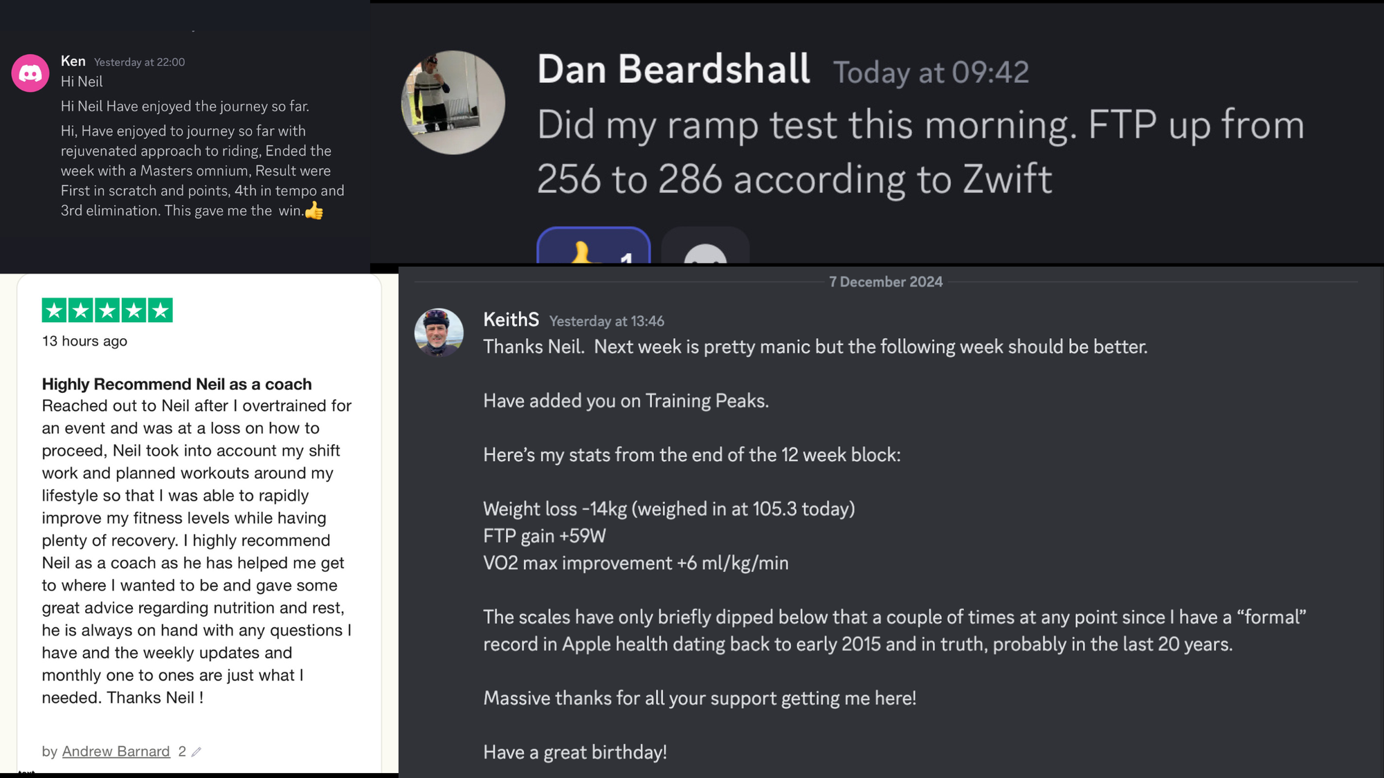 "The whole package was brilliant and the results achieved (>12kg weight loss in 10 weeks; fitter; leaner; more muscle definition, FTP up (final number TBC), VO2 max up 7 ml/kg/min) have been incredible - all expectations have been shattered.